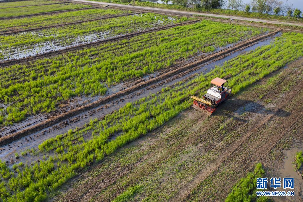4月5日,浙江紹興諸暨市次塢鎮(zhèn)紅旗村紅旗合作社農(nóng)民駕駛農(nóng)機(jī)在翻耕農(nóng)田,準(zhǔn)備播種早稻(無(wú)人機(jī)照片)。