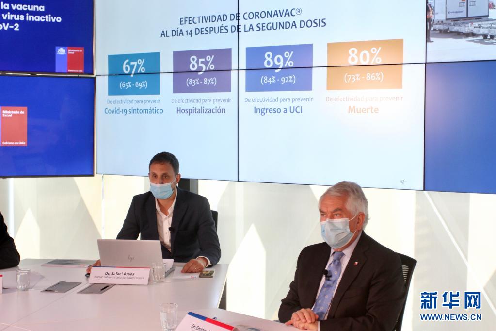 4月16日,智利衛(wèi)生部長(zhǎng)帕里斯(右)與智利衛(wèi)生部顧問(wèn)阿勞斯在圣地亞哥出席發(fā)布會(huì),公布中國(guó)科興新冠疫苗保護(hù)效果在該國(guó)的真實(shí)世界研究結(jié)果。新華社發(fā)(智利衛(wèi)生部供圖)