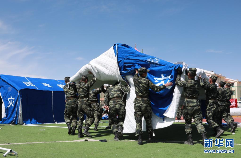 5月24日,武警青??傟牴逯ш牂C動大隊官兵為花石峽鎮(zhèn)藏文中心寄宿制小學搭建帳篷教室。新華社記者 劉新 攝