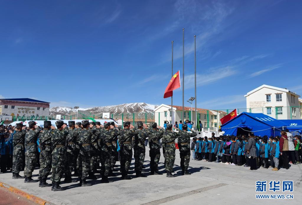 5月24日,武警青海總隊果洛支隊機動大隊官兵與花石峽鎮(zhèn)藏文中心寄宿制小學的師生一同參加升國旗儀式。新華社發(fā)(宦爵才郎 攝)