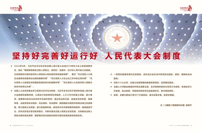 ◇2024年9月,习近平总书记在庆祝全国人民代表大会成立70周年大会上发表重要讲话,指出“要围绕发展全过程人民民主,坚持好、完善好、运行好人民代表大会制度,为实现新时代新征程党和人民的奋斗目标提供坚实制度保障”,要求“充分发挥人大保证全面有效实施宪法法律的重要作用”“充分发挥人大在立法工作中的主导作用”“充分发挥人大监督在党和国家监督体系中的重要作用”“充分发挥人大在密切同人民群众联系中的带头作用”。
