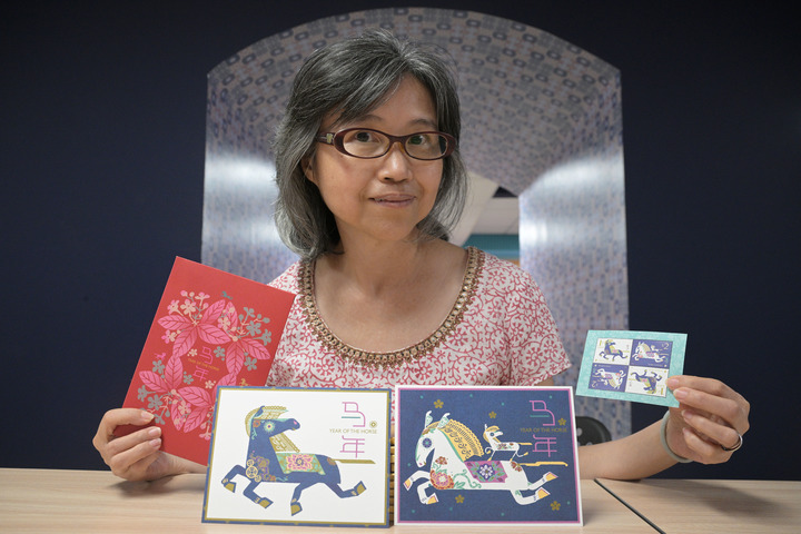 2月6日,在新加坡邮政总局,设计师林愿玲手举她设计的马年明信片与邮票。新华社发(邓智炜摄)