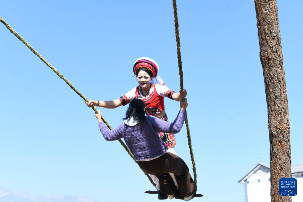 2月17日,云南省大理白族自治州剑川县马登镇文屏村的白族村民在荡秋千。
