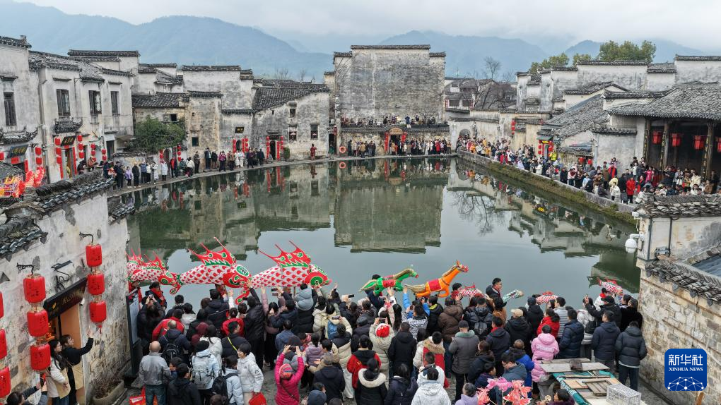 2月17日,游客在安徽省黄山市黟县宏村体验“宏村大拜年”民俗巡游活动(无人机照片)。