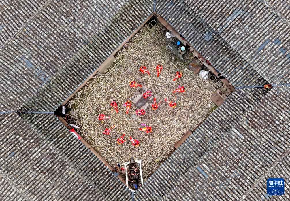 2月17日,在浙江省台州市仙居县埠头镇西亚村,民间艺人表演“跳跳马”(无人机照片)。