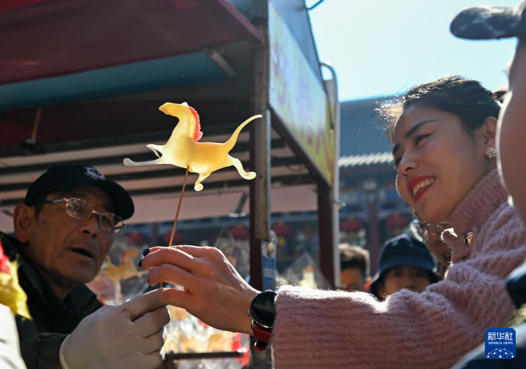 2月17日,在天津古文化街,糖画艺人张福泉(左)将马造型的糖人递给顾客。