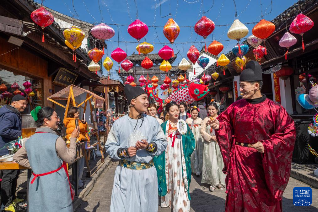 2月17日,在江苏省高邮市盂城驿景区,演员参加古风巡游。