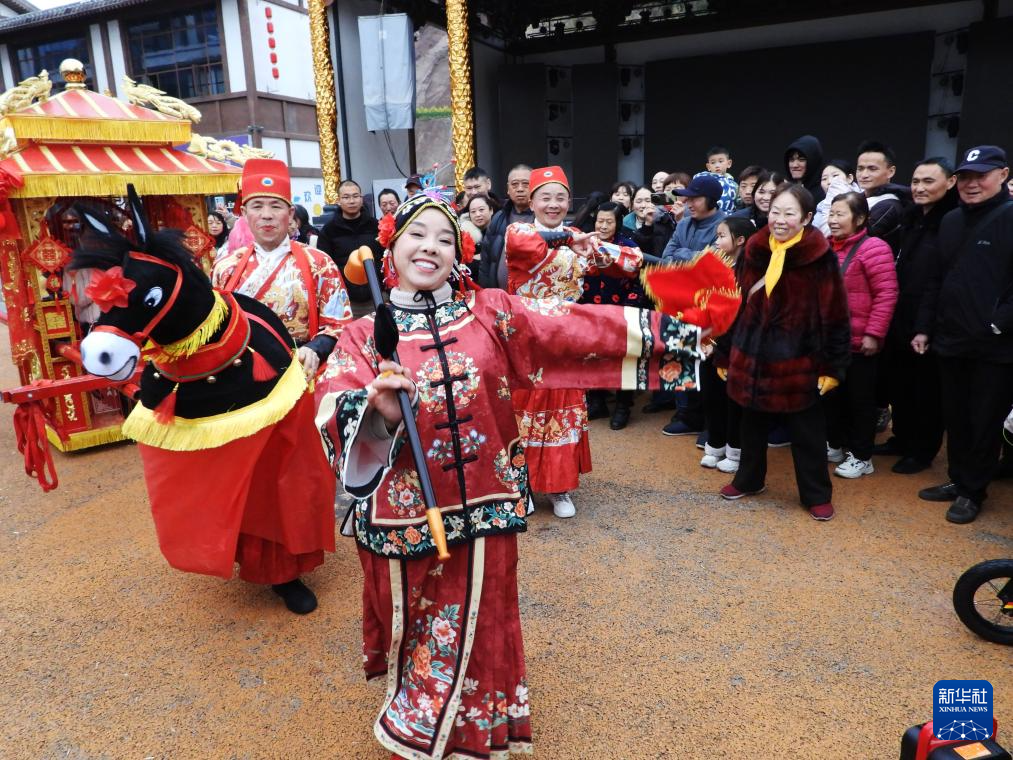 2月17日,在四川省达州市达川区三里坪街道,市民和游客观看民间艺人表演《车车灯》秧歌。