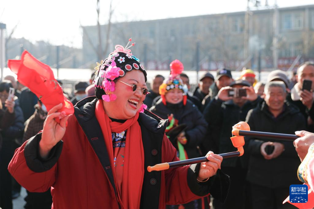 2月17日,在山东省荣成市市民文化活动公园,民间艺人进行渔家秧歌、渔家大鼓等民俗表演。