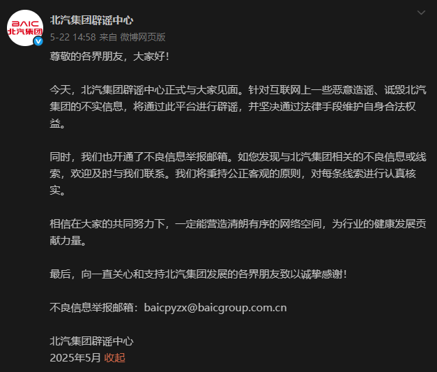5月22日,北汽集团辟谣中心官微上线。据介绍,北汽集团辟谣中心主要针对互联网上一些恶意造谣、诋毁北汽集团的不实信息,将通过此平台进行辟谣,并坚决通过法律手段维护自身合法权益。