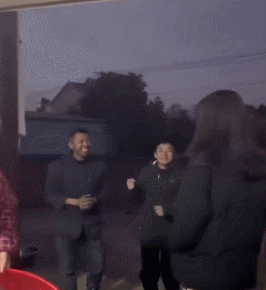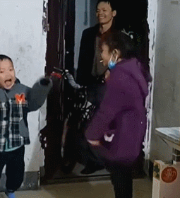 悄悄站在奶奶身后抓着手臂一同跳舞