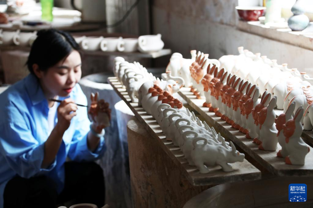 4月12日,在禹州市神垕古镇一家钧瓷企业,一位员工为钧瓷素胎上釉色。