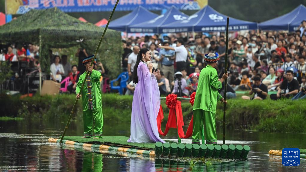 当日,广西钦州市在钦北区贵台镇洞利江畔举行实景演出,欢庆“三月三”传统佳节。