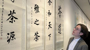 5月7日,在瑞典首都斯德哥尔摩的中国文化中心,参观者观看书法展示。