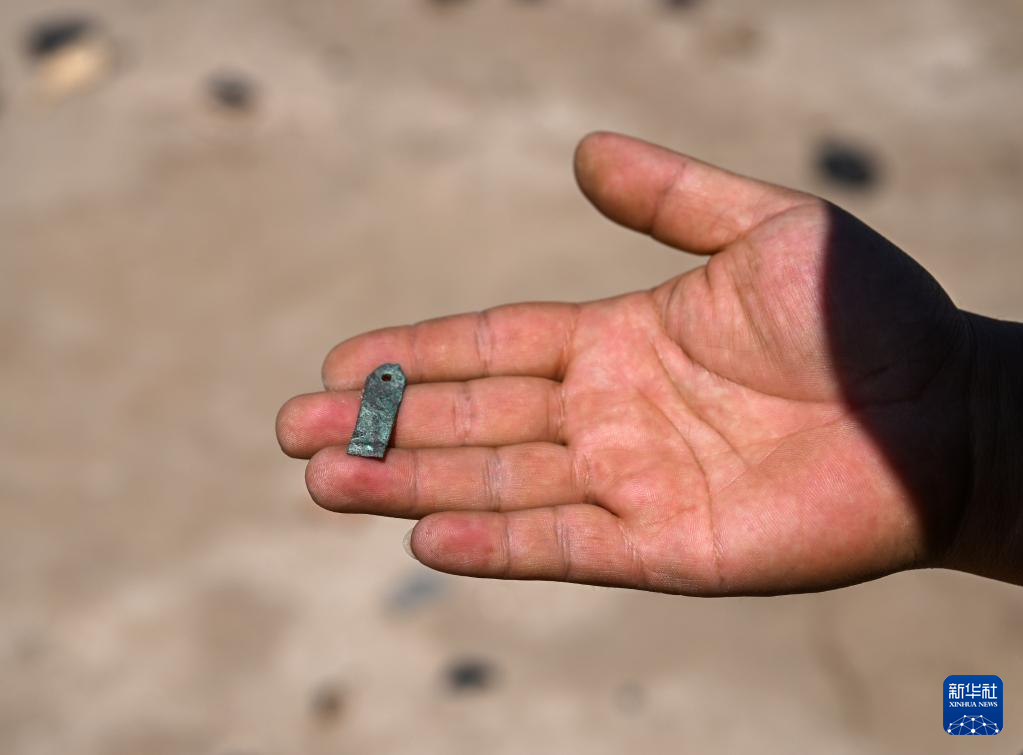 这是额济纳旗文物保护中心工作人员在巡护中发现的铜片(6月2日摄)。