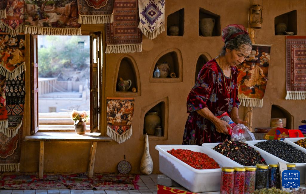 在新疆鄯善县吐峪沟乡吐峪沟村,村民努尔买买提·艾合买提在自家经营的饮品店内休息(10月7日摄)。他家房屋完成维修加固后,便投资开设了饮品店,同时布置了几间房子供游客参观。