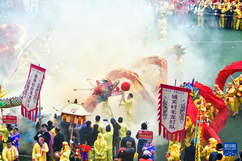 2月27日,贵州省铜仁市石阡县举办主题为“龙腾马跃·福满阡城”的仡佬毛龙节贺新春活动。来自全县的80支毛龙队和9支非遗展演队齐聚石阡县城,举行毛龙巡游、毛龙祈福、舞龙大赛、非遗展演等活动,欢庆毛龙节,喜迎新春。