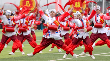3月2日,在陕西旬阳市蜀河镇蜀河社区,表演人员在“烧狮子”间歇时表演划彩莲船。