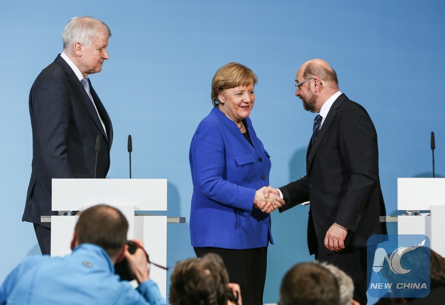 German Chancellor and leader of German Christian Democratic Union (CDU) Angela Merkel (C) shakes hands with leader of German Social Democratic Party (SPD) Martin Schulz (R) after a joint press conference at the headquarters of SPD, in Berlin, Germany, on Jan. 12, 2018. (Xinhua/Shan Yuqi)