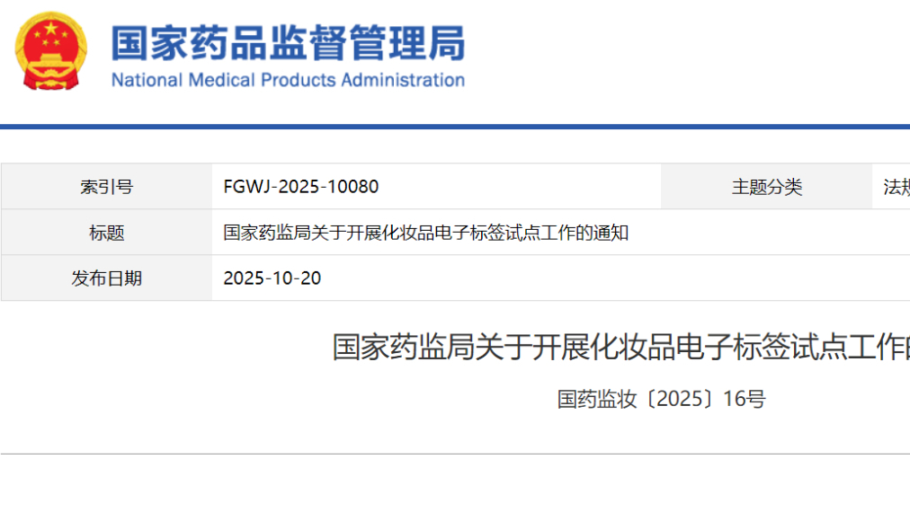 國家藥監(jiān)局關(guān)于開展化妝品電子標(biāo)簽試點(diǎn)工作的通知 國藥監(jiān)妝〔2025〕16號