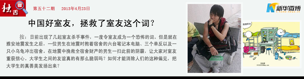 【室友中的戰(zhàn)斗機】 人固有一室友,或投毒殺人,或拯救其余室友電腦六臺單反三臺烏龜一籠于地震之中…… 他一個人拯救了全宿舍的財產(chǎn),對他的敬佩之情猶如滔滔江水連綿不絕!