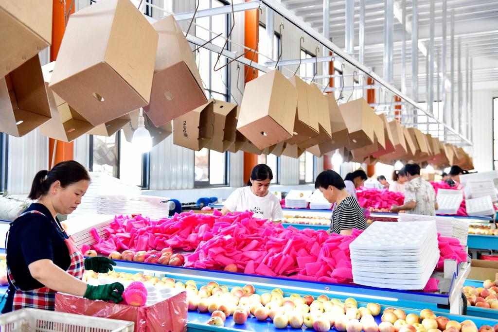 6月26日,工人在惠民县大年陈镇一家冷链物流公司分拣苹果。