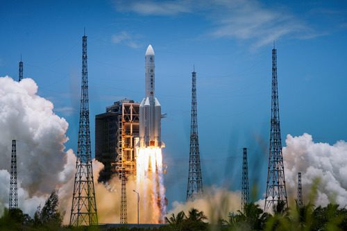 ????我國在海南島東北海岸中國文昌航天發(fā)射場,用長征五號遙四運載火箭將我國首次火星探測任務“天問一號”探測器發(fā)射升空(7月23日)。新華社發(fā)(郭文彬 攝)