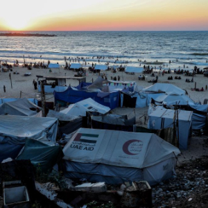 这是8月18日在加沙城拍摄的流离失所的巴勒斯坦人居住的帐篷。