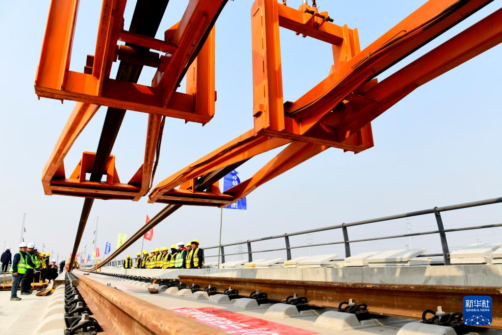 3月10日,在济(南)滨(州)高铁山东滨州站,中铁四局的工作人员在进行铺轨作业。