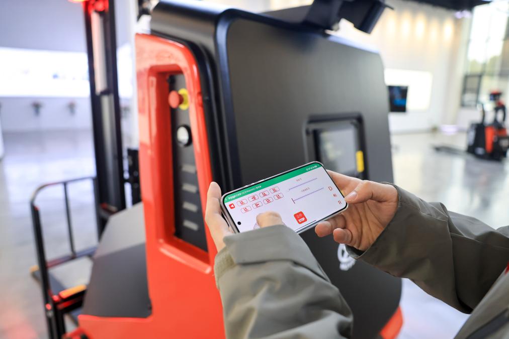 3月16日,在江苏江阴—靖江工业园区江苏中力叉车有限公司展厅内,技术人员在演示掏箱机器人。
