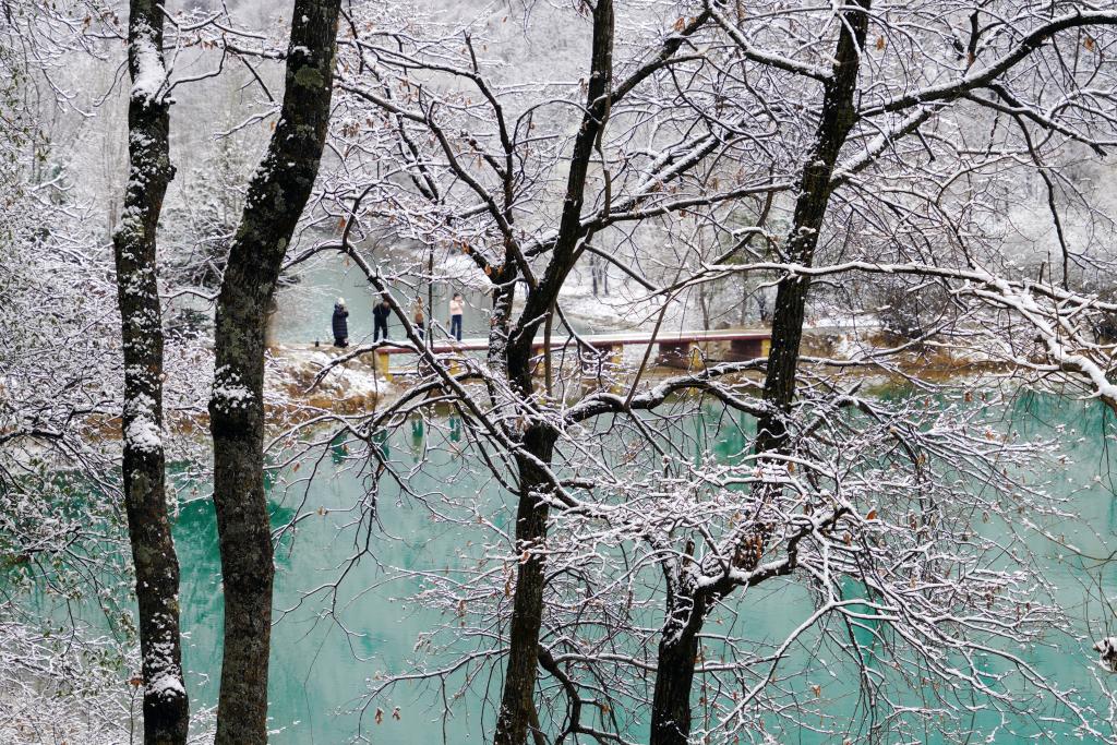 临近春分节气,甘肃省陇南市宕昌县出现降雪,春雪将官鹅沟景区装扮得银装素裹,白雪覆盖下的树木、湖泊和村庄共同构成一幅美丽画卷。