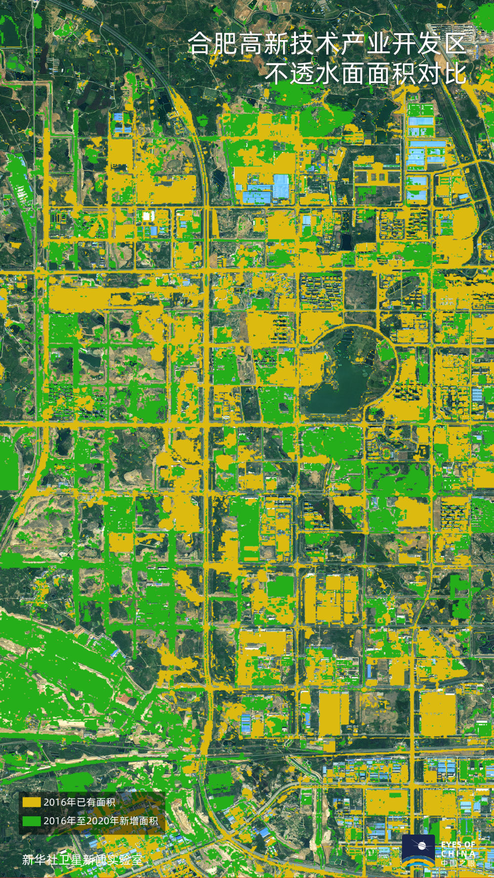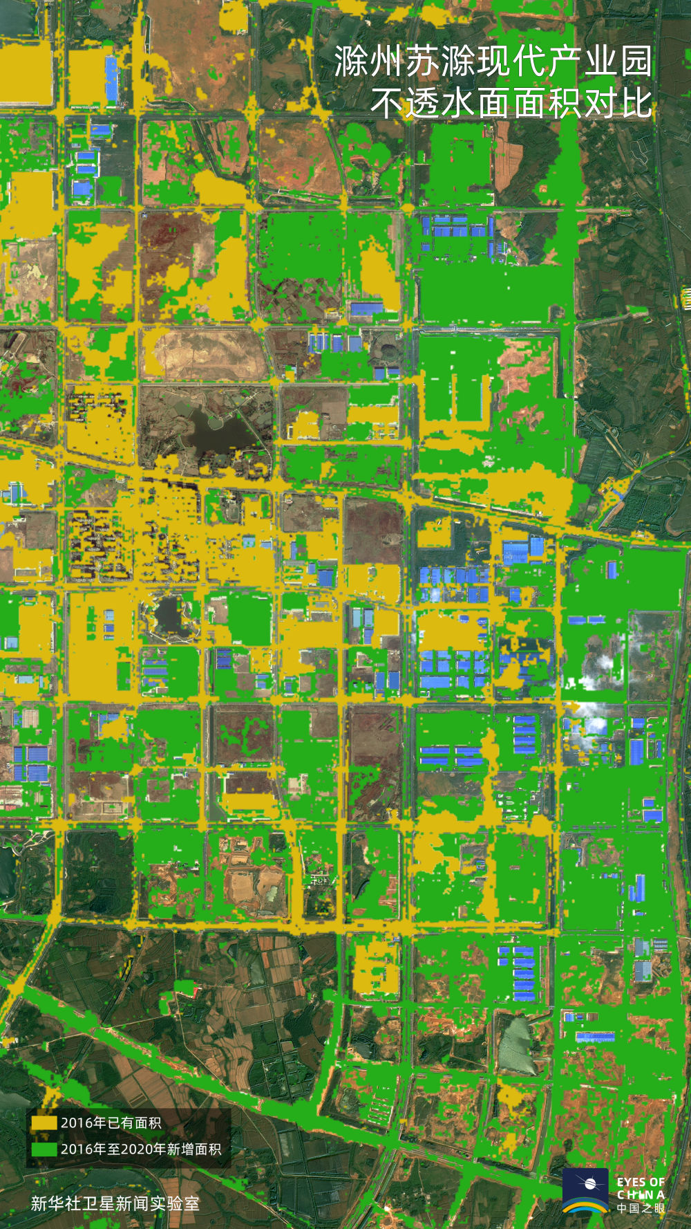 黃色覆蓋區(qū)域?yàn)?016年已有不透水面區(qū)域,綠色為2020年較2016年新增區(qū)域。大幅增加的綠色顯示,滁州和合肥的工業(yè)園區(qū)范圍在快速向外延伸,經(jīng)濟(jì)發(fā)展邁上新臺階。