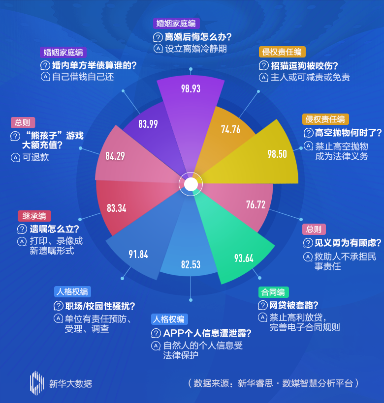 民法典草案1260個條文中,哪些最受關注?新華睿思數據顯示,最吸引人的話題為“離婚冷靜期”,網絡熱度值高達98.93,緊隨其后的,是與百姓日常生活緊密相關的“高空拋物”和涉及群眾“錢袋子”的“高利放貸”。