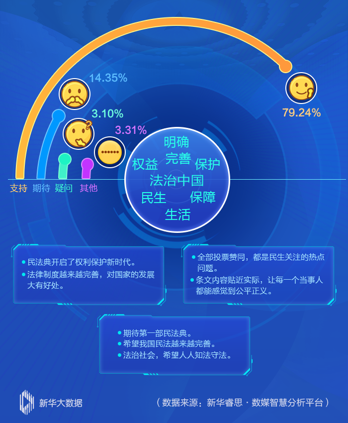 新華睿思數據顯示,近八成網民對民法典草案表示支持和肯定,認為“民法典開啟了權利保護新時代”“法治中國給老百姓帶來實實在在的好處”。從話題熱詞分析來看,“法治中國”“完善”“保護”三大熱詞有效地呼應了編纂民法典的出發(fā)點和落腳點。