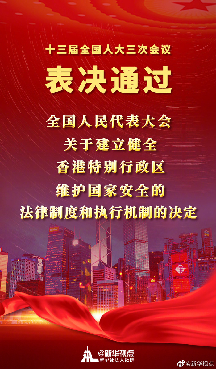 新華社北京5月28日電? 5月28日下午,十三屆全國人大三次會議以高票表決通過《全國人民代表大會關于建立健全香港特別行政區(qū)維護國家安全的法律制度和執(zhí)行機制的決定》。