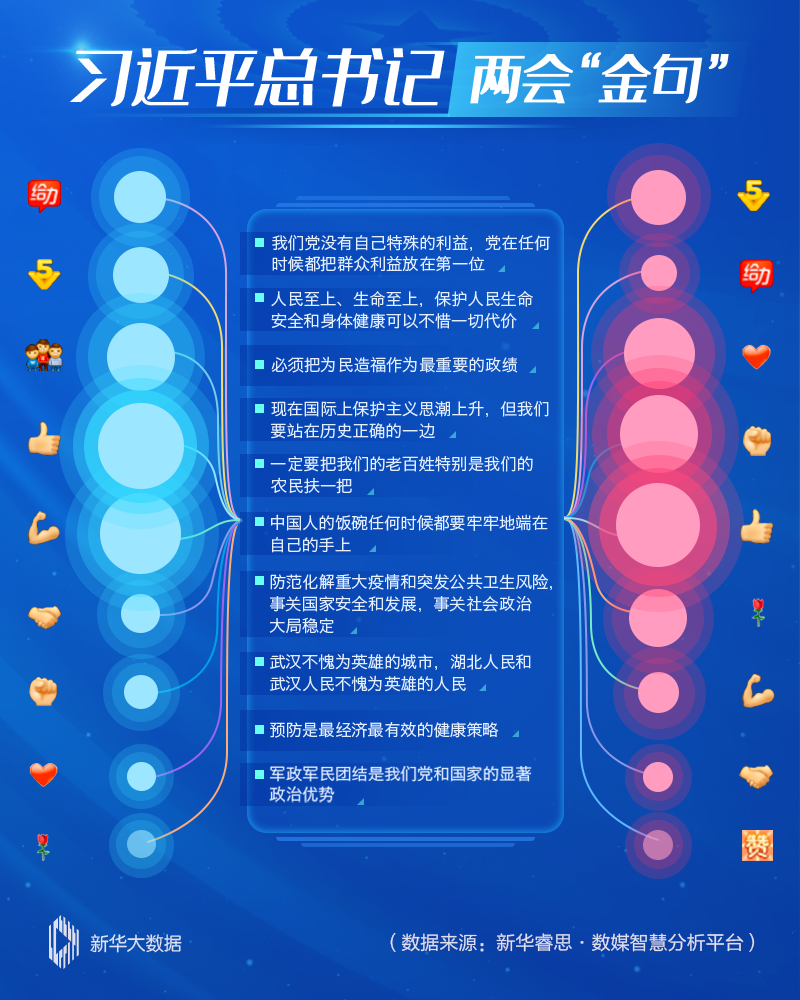總書記飽含深情的話語一經(jīng)發(fā)出,立刻通過網(wǎng)絡(luò)傳導(dǎo)觸及每一個網(wǎng)民的情感神經(jīng),引發(fā)大量情感共鳴。兩會期間,新華睿思持續(xù)追蹤相關(guān)數(shù)據(jù),并對網(wǎng)民的情緒變化和留言進行集納分析。