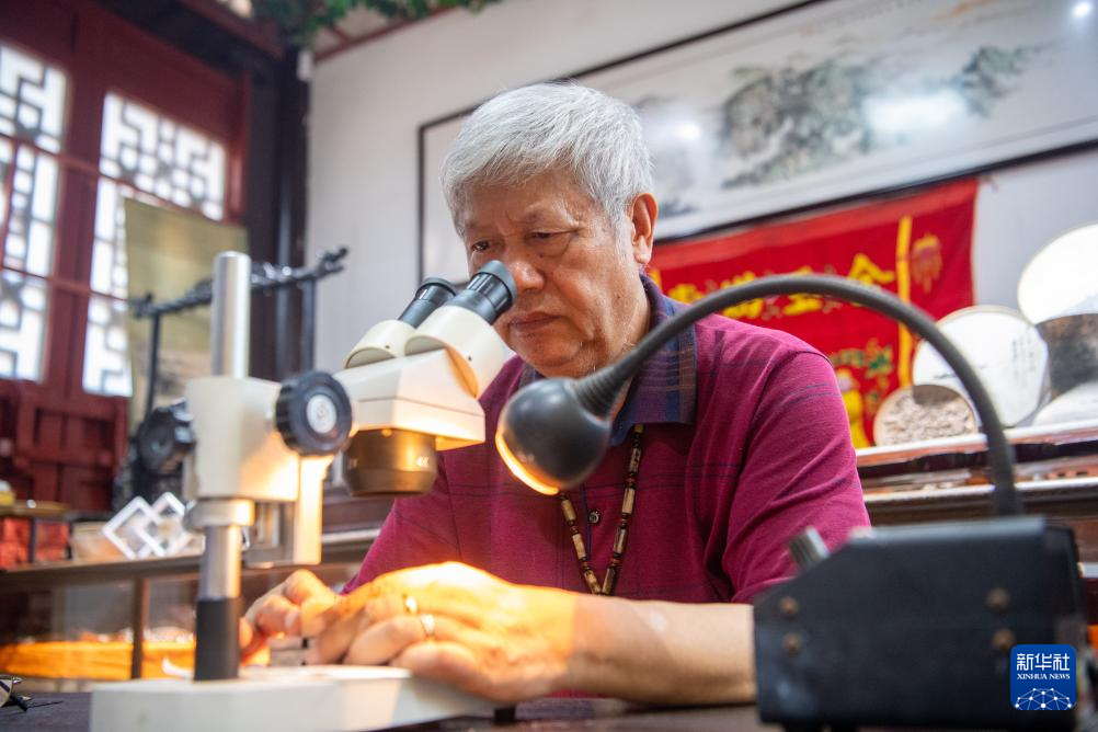 7月31日,潘启慧在调整显微镜准备观察微刻作品。