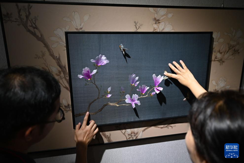 8月14日,北京服装学院副教授沈华菊(右)向嘉宾介绍展出的苏绣。