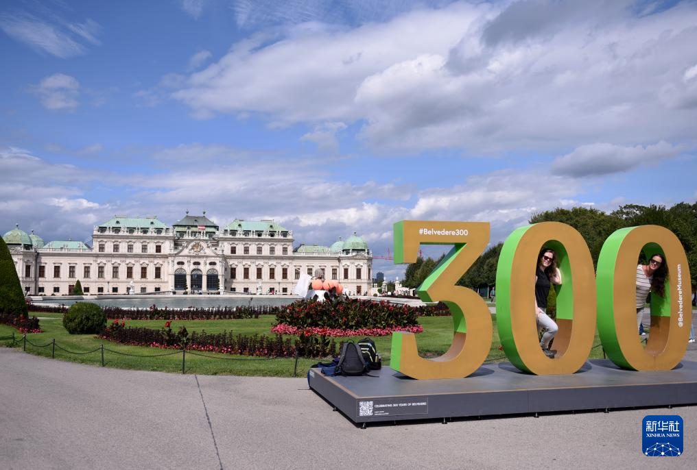 8月31日,在奥地利维也纳,游客在上美景宫前与300周年的标识合影留念。