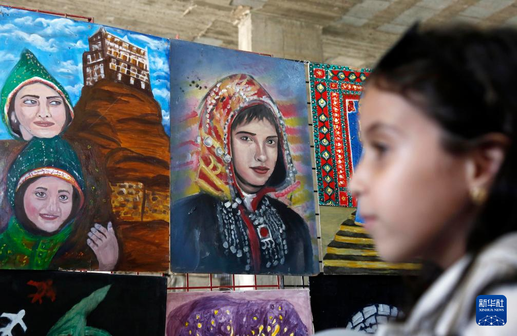 4月14日,在也门首都萨那,一名女孩参观艺术展上的画作。