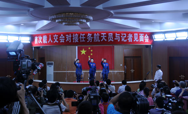 航天員景海鵬、劉旺、劉洋與記者見(jiàn)面會(huì)