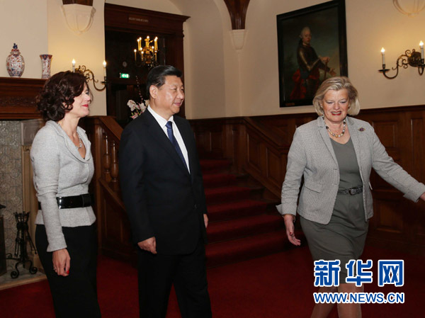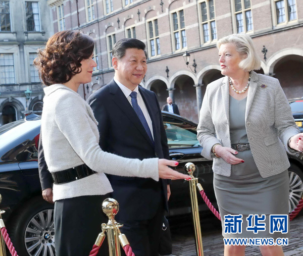 ????3月24日,國家主席習(xí)近平在海牙會見荷蘭議會一院議長布勒克-克諾爾(右)和二院議長范米爾滕伯格。 新華社記者 劉衛(wèi)兵 攝