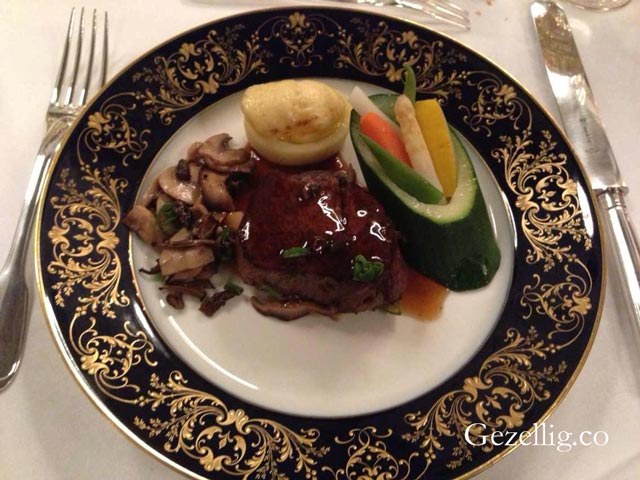 到主菜了,這是一道阿根廷名菜。Tournedos是位于里脊末端的那塊肉,通常都是厚且圓,根據(jù)個人口味可以三分至五分熟,鮮嫩至極。上桌時要搭配Madeira醬汁,是專門為肉類調(diào)配的。本次的菜還用了羊肚菌菇,因外形酷似羊肚而得名。蔬菜選了荷蘭人超喜歡的西葫蘆,挖空后,放上其他蔬果。另一個是酥皮焗土豆, Dauphinioise 這個詞來源于法語東南部的傳統(tǒng)地區(qū)Dauphine,這道菜是將土豆切片,然后和奶酪一起焗制,表皮是脆的。國宴上這道菜已經(jīng)經(jīng)過改良,做成了一小塊。