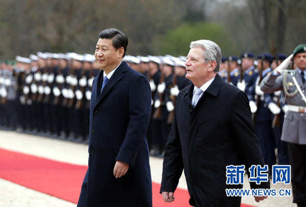 ????3月28日,國(guó)家主席習(xí)近平在柏林會(huì)見德國(guó)總統(tǒng)高克。會(huì)見開始前,高克在總統(tǒng)府為習(xí)近平舉行歡迎儀式。 新華社記者 鞠鵬 攝