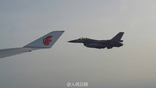 ????當(dāng)習(xí)近平乘坐的專機(jī)進(jìn)入比利時領(lǐng)空時,比利時皇家空軍兩架戰(zhàn)機(jī)升空護(hù)航。(圖片來源:《人民日報》法人微博)