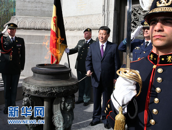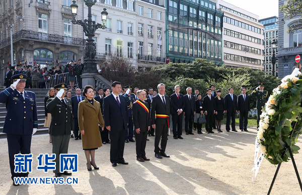 3月30日,中國(guó)國(guó)家主席習(xí)近平在布魯塞爾向比利時(shí)無名戰(zhàn)士墓獻(xiàn)花圈。 新華社記者 龐興雷 攝