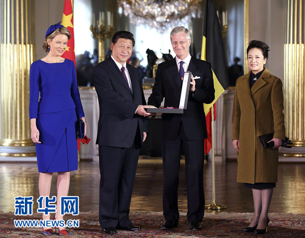 ????3月30日,國(guó)家主席習(xí)近平在布魯塞爾會(huì)見比利時(shí)國(guó)王菲利普。這是菲利普國(guó)王向習(xí)近平授予利奧波德大綬帶勛章和證書。 新華社記者 蘭紅光 攝