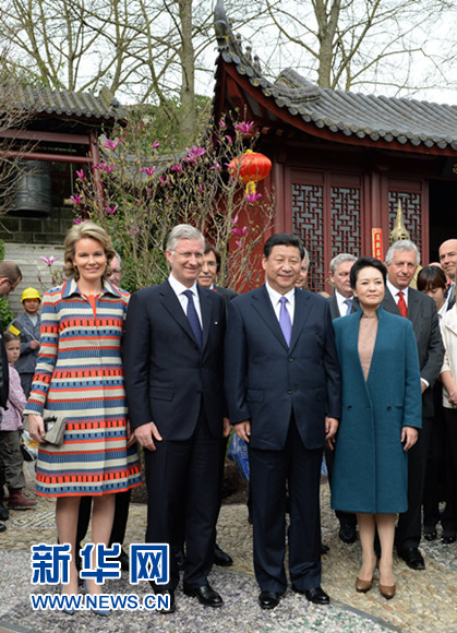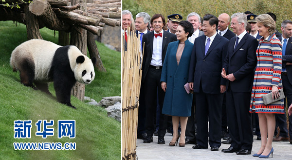 ????習(xí)近平和夫人彭麗媛抵達(dá)時(shí),受到菲利普國王和瑪?shù)贍柕峦鹾?、比利時(shí)首相迪呂波熱情迎接。兩國領(lǐng)導(dǎo)人一同步入中國園。亭臺(tái)樓閣、雕梁畫棟、鳥語花香,這里宛如一幅恬靜祥和的中華寫意畫。兩國元首夫婦沿著回廊曲徑,穿過青翠竹林,前往大熊貓園。他們邊走邊談,回顧中比兩國友好交往。