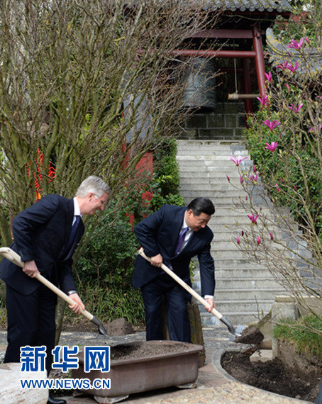 ????3月30日,國家主席習(xí)近平和比利時(shí)國王菲利普共同出席比利時(shí)天堂公園大熊貓園開園儀式。這是習(xí)近平與菲利普國王共同為一棵象征友誼的玉蘭樹培上新土。 新華社記者 馬占成 攝