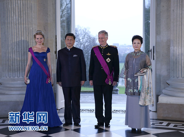 ????當(dāng)晚,比利時國王菲利普在拉肯宮舉行隆重國宴歡迎習(xí)近平到訪。拉肯宮內(nèi),燈火輝煌,鮮花綻放。習(xí)近平和夫人彭麗媛抵達(dá)時,受到菲利普國王和瑪?shù)贍柕峦鹾鬅崆橛印蓢追驄D一同步入宴會大廳。奏中比兩國國歌。